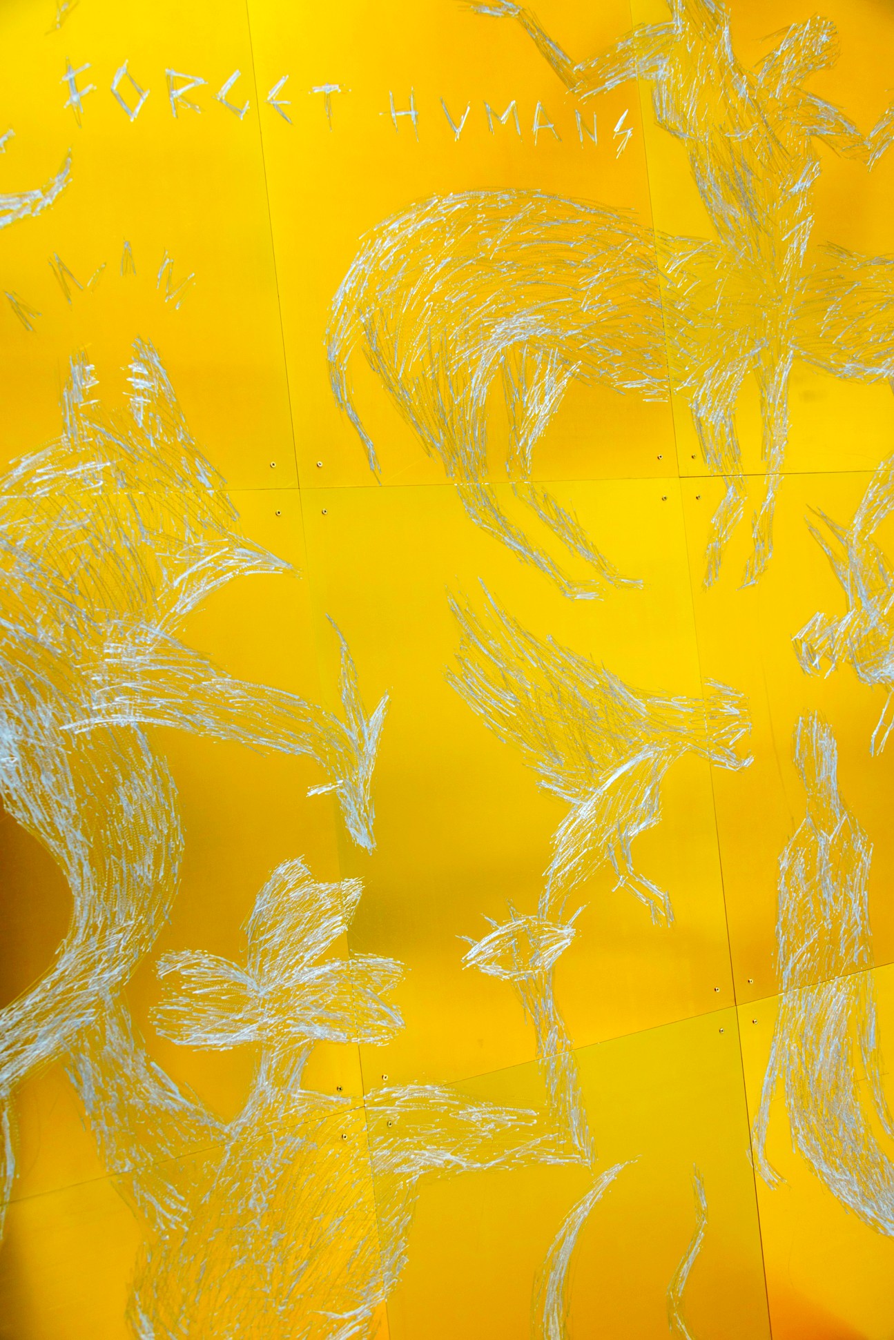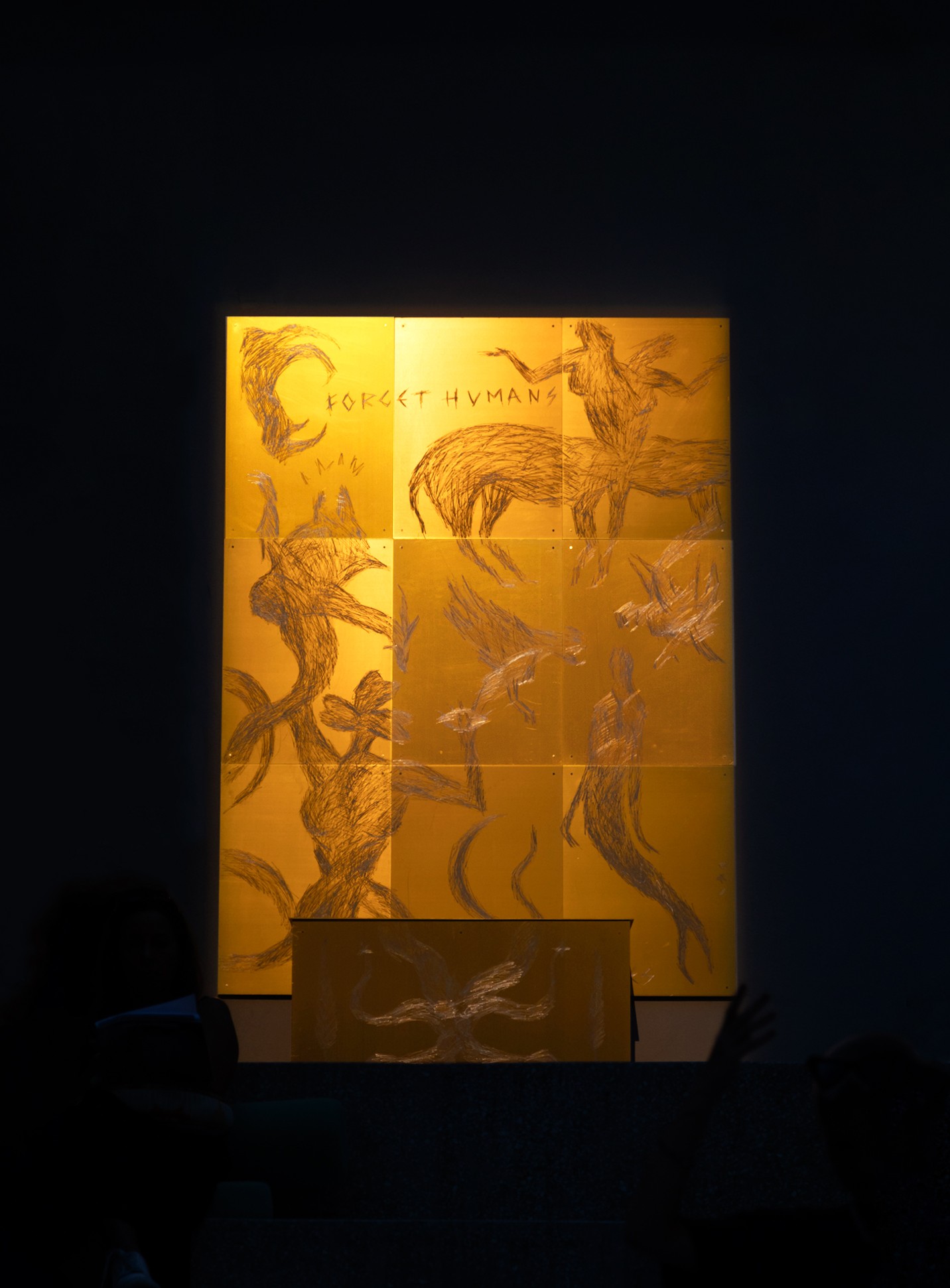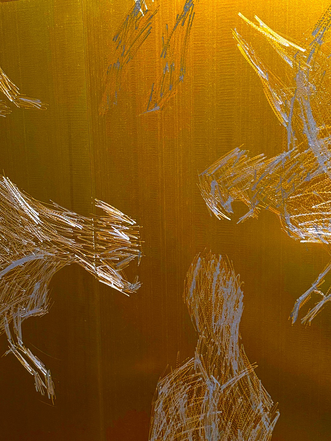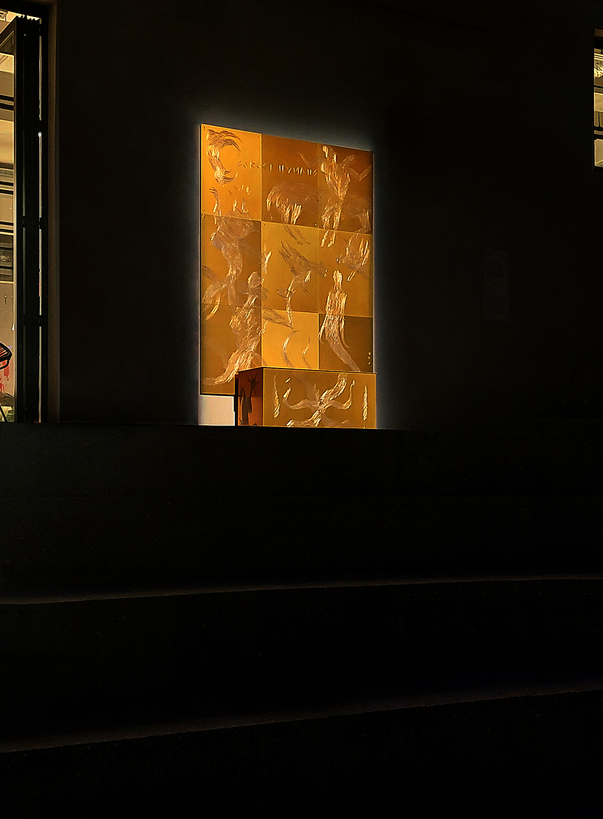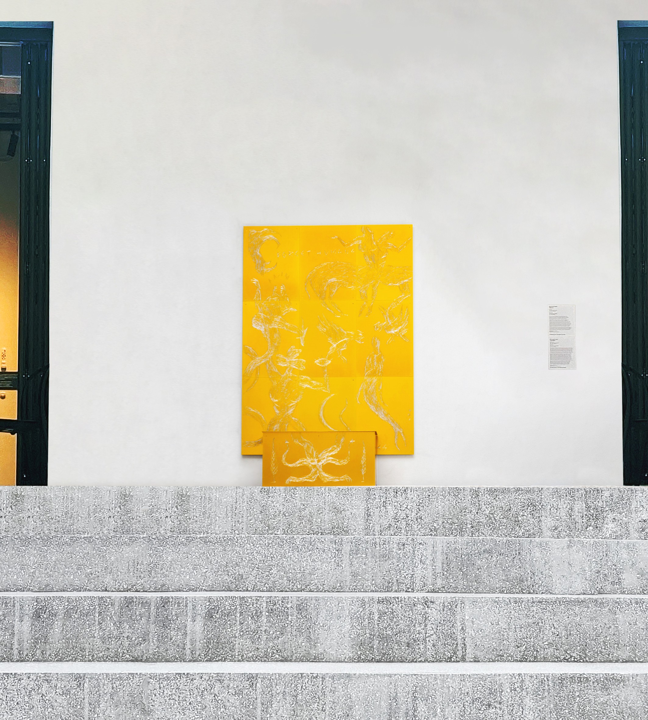 Personal memories, dreams, and experiences merge with myths to form new narratives—both as continuations and ruptures with the old. The stories are re-told from the present in the place where they were born. The new monsters are linked to ancient ones transformed by divine forces against their will, serving as allegories for today’s socio-political systems, where escape is impossible. In this revised order, monsters become the protagonists seeking freedom. Gold, once symbolizing beauty, reward, and desire, is overtaken and possessed by them.