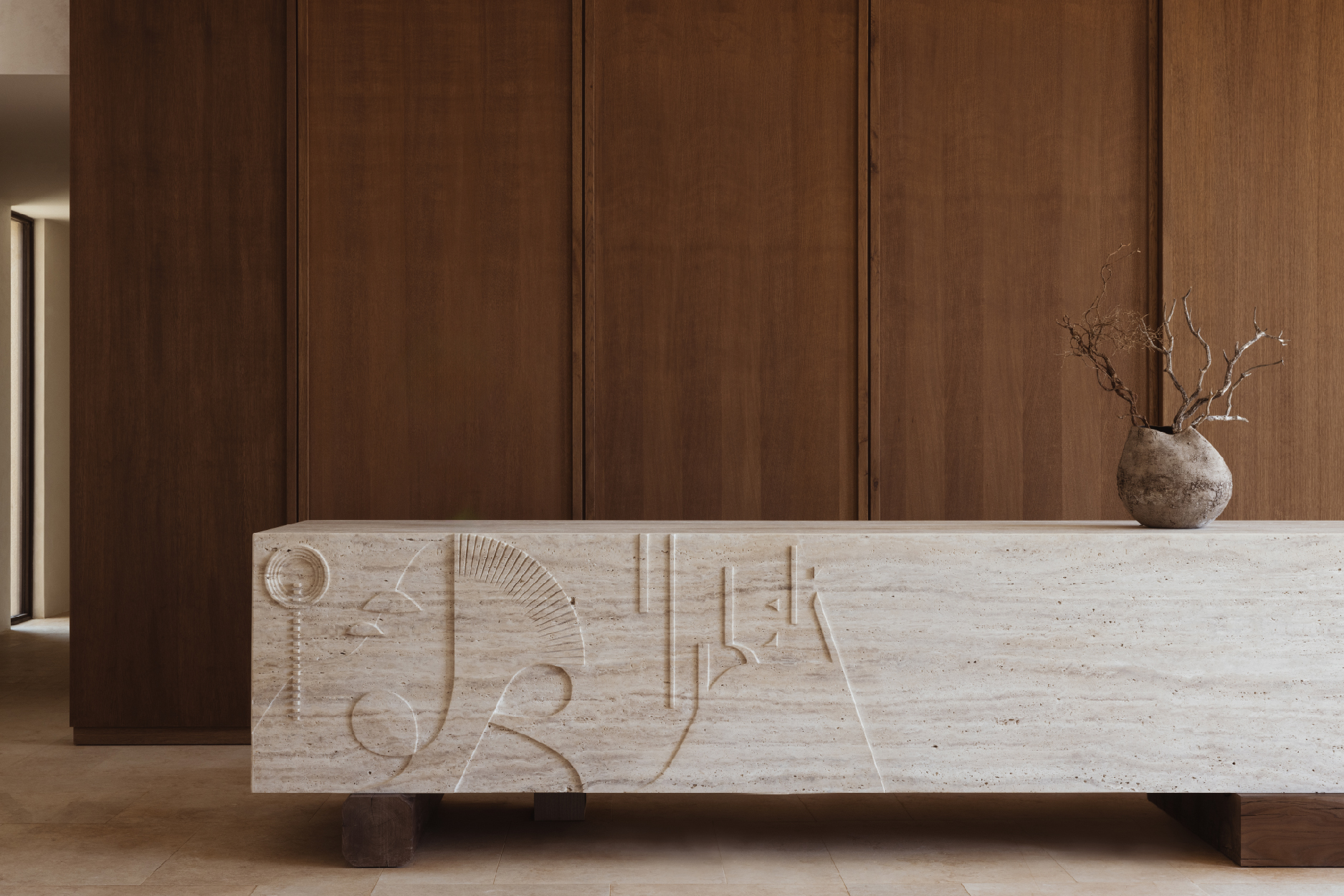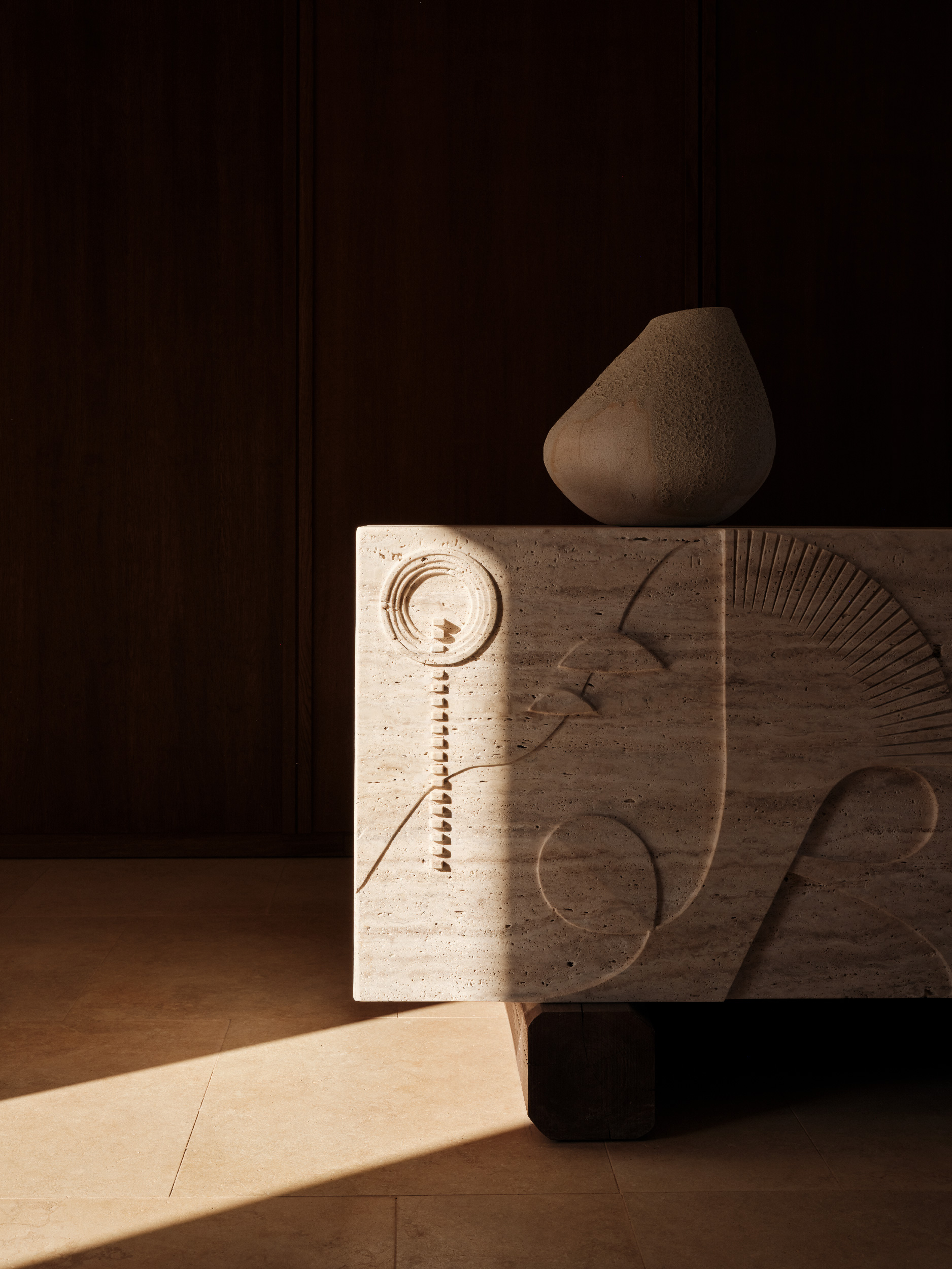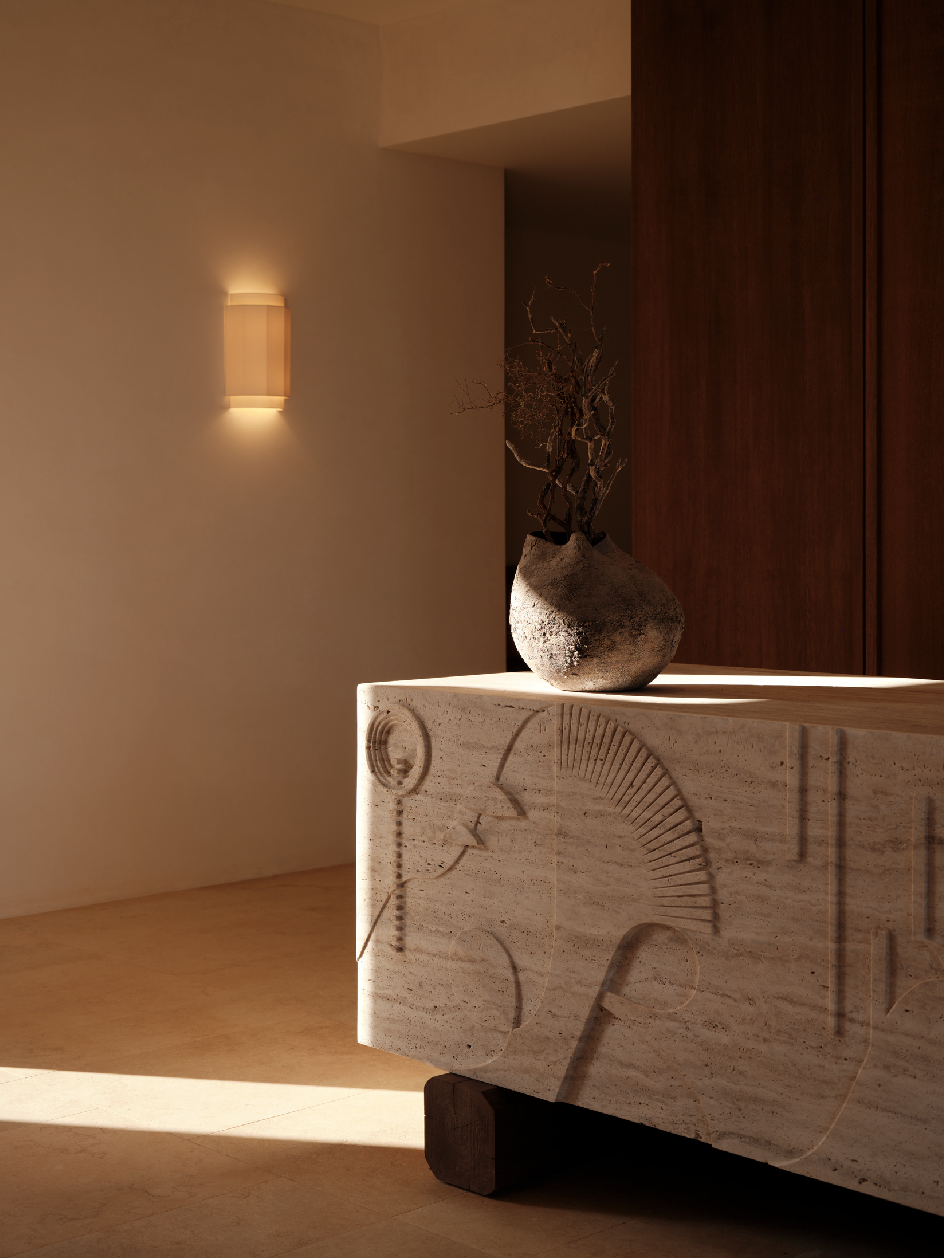 The reception tells Folegandro's unique story, reflecting its deep connection to the natural environment, fauna and the celestial positioning over it. The piece celebrates the beauty and cultural heritage of the area giving visitors an immediate sense of the place.