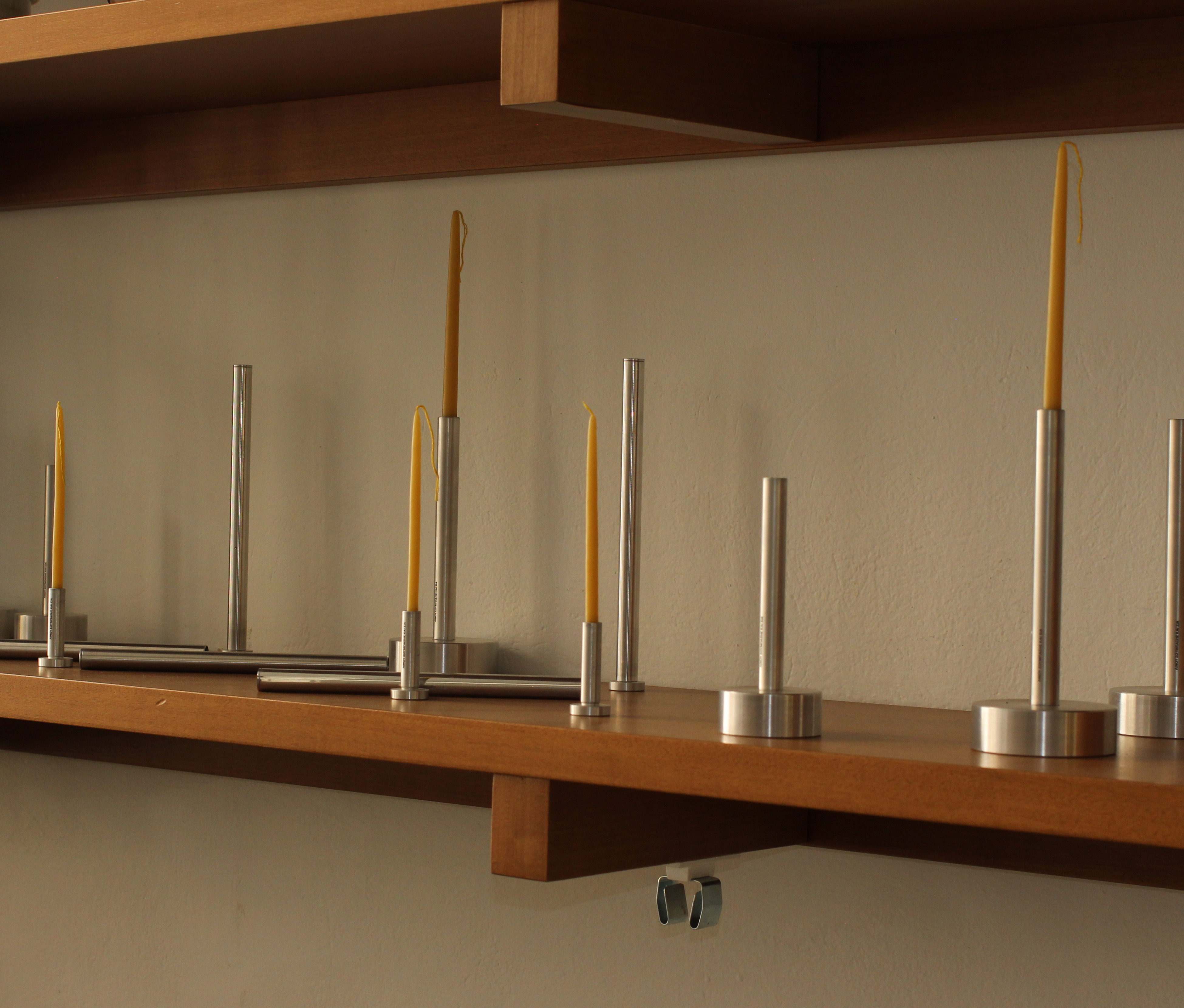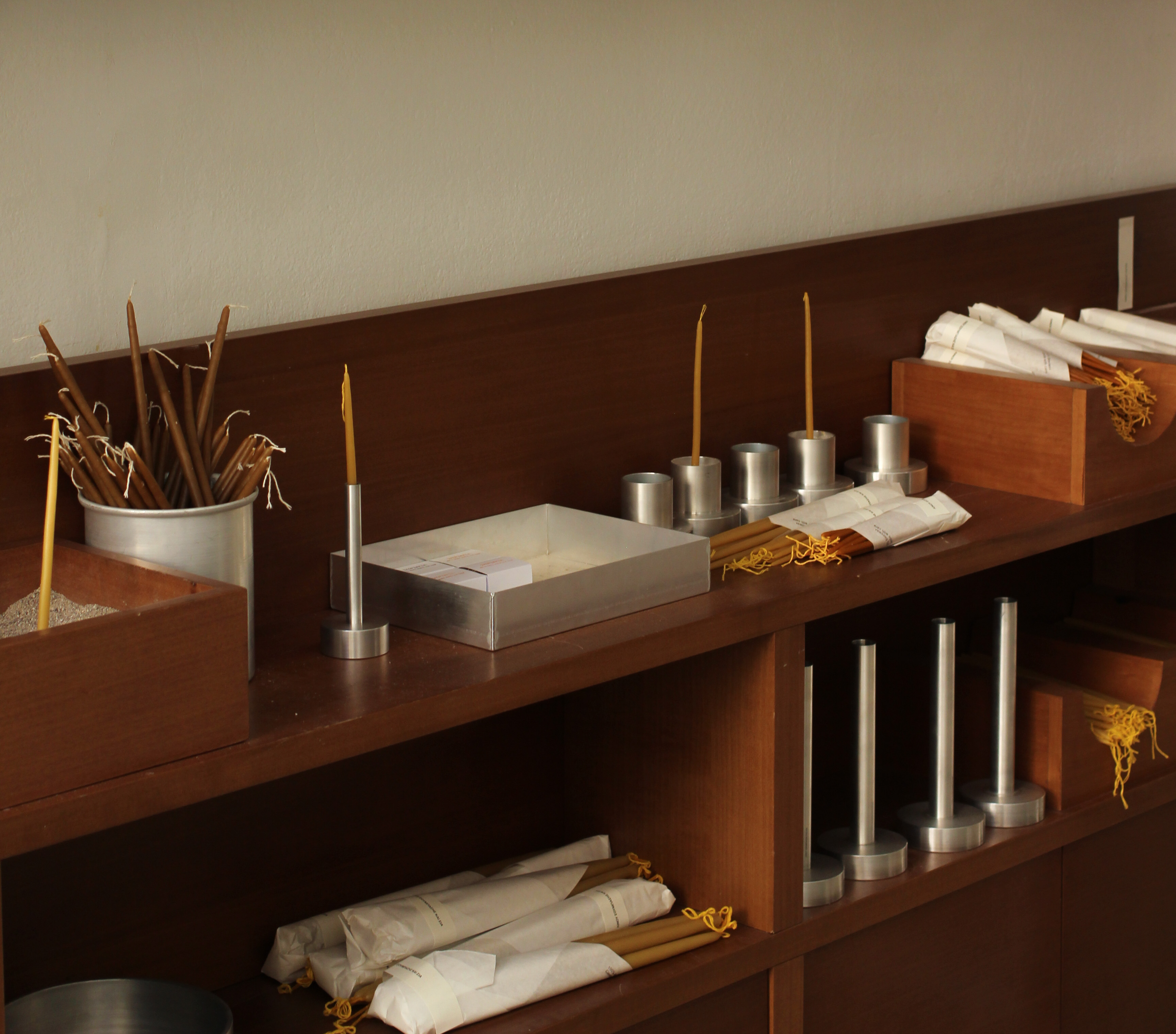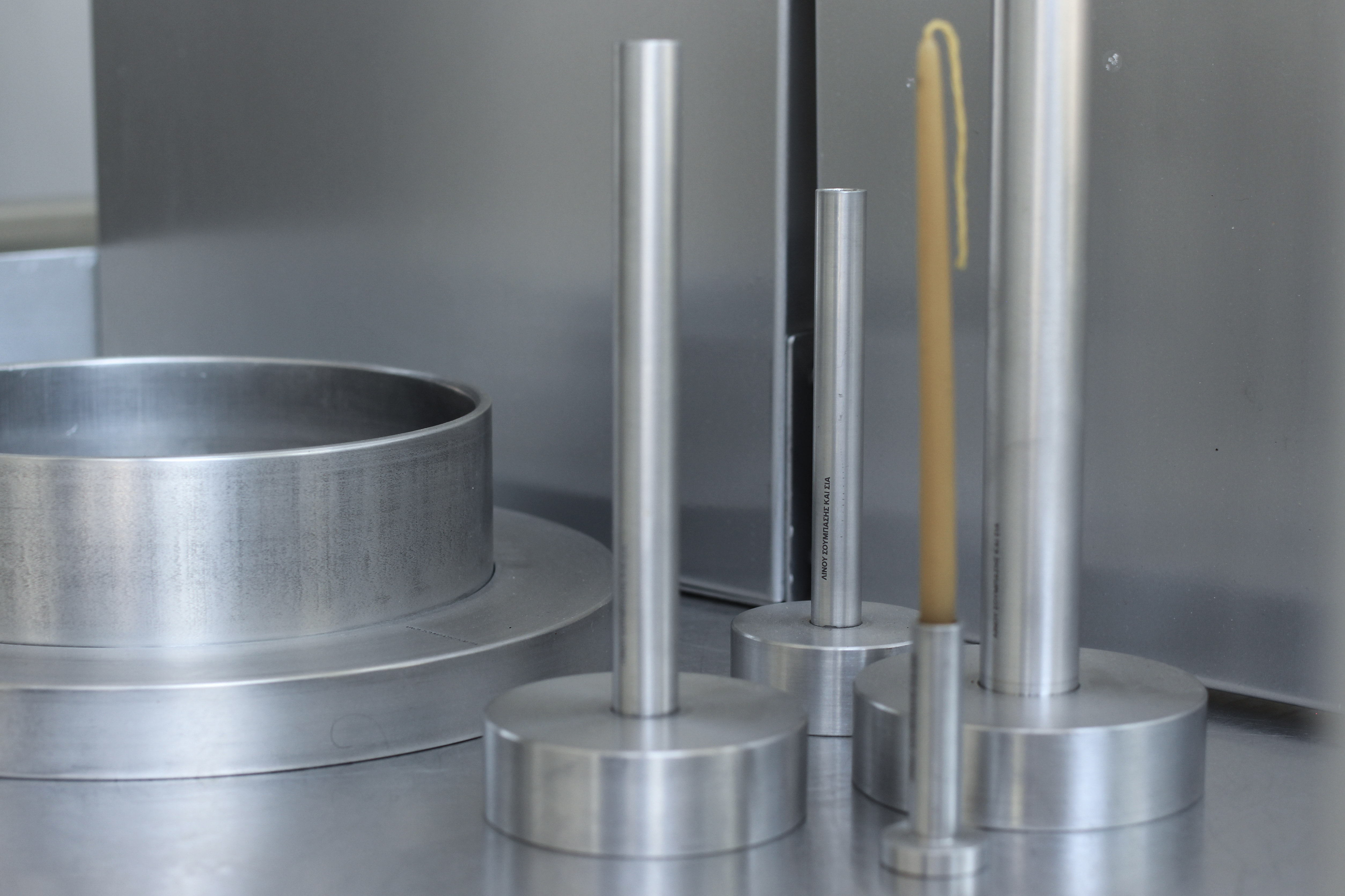 The bases: BOI, MANUALI, ENA S are defined by and faithfully follow the scale of the church candles. The bases are handcrafted one by one by local makers, and their production takes hours, creating a contrast with the nature of the industrial material.