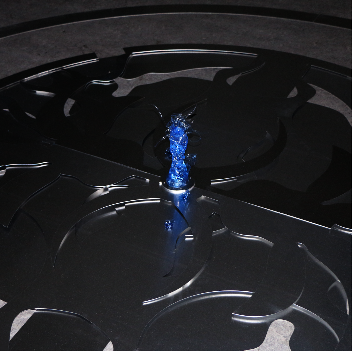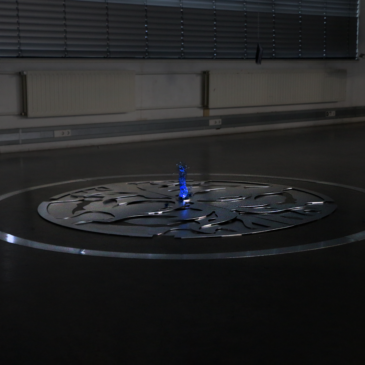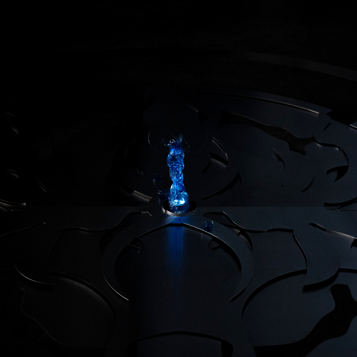 Its form invites us to gather around the center and face towards it, but at the same time creates a distance from the desired water, making it seem apparently unreachable. The water is contained within an attractive, hypnotic shape inviting everyone to have it.