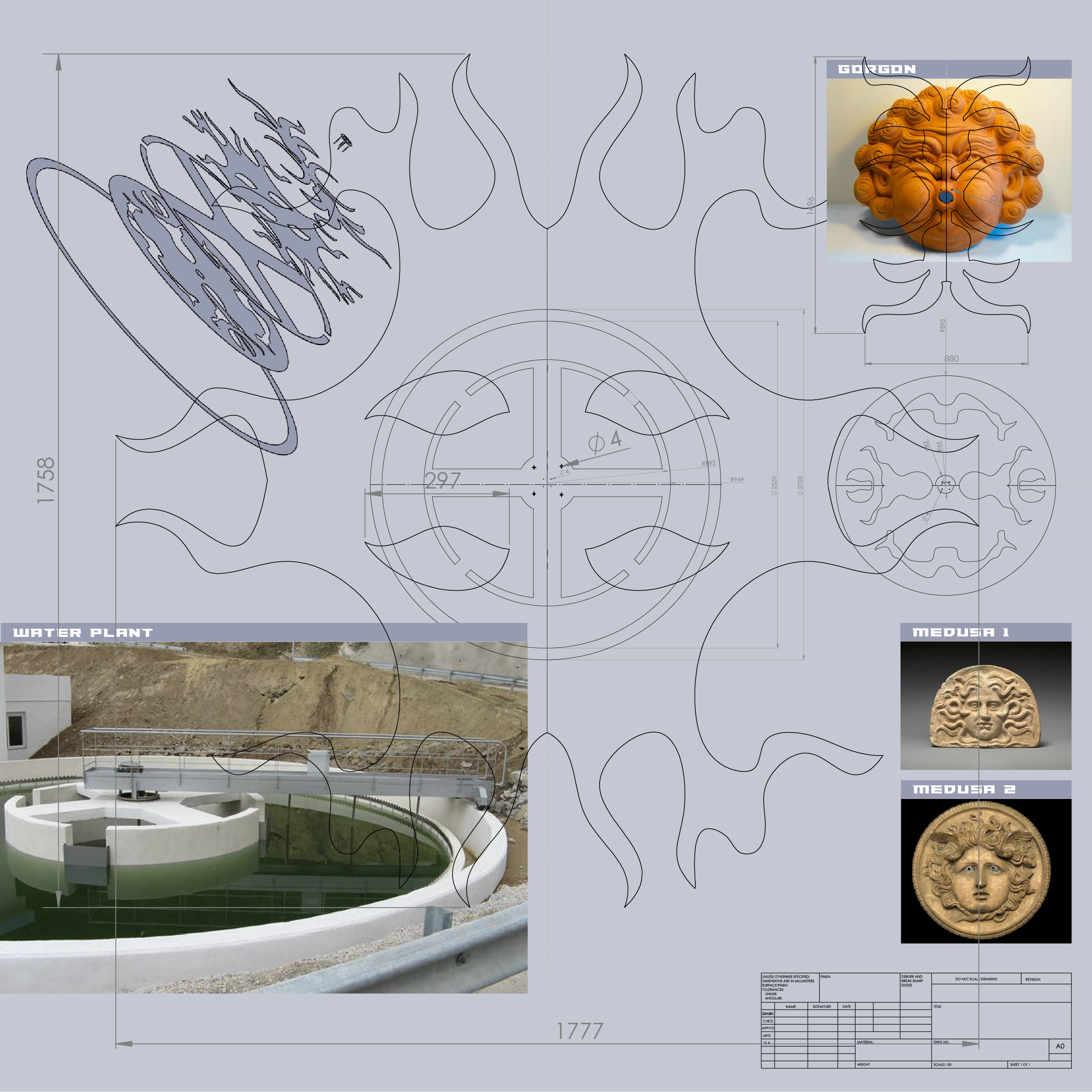 The fountain of the monsters consists of layers derived from the shapes of mythological and mechanical constructions related to clean drinkable water: the shapes of gorgons and of water treatment plants.